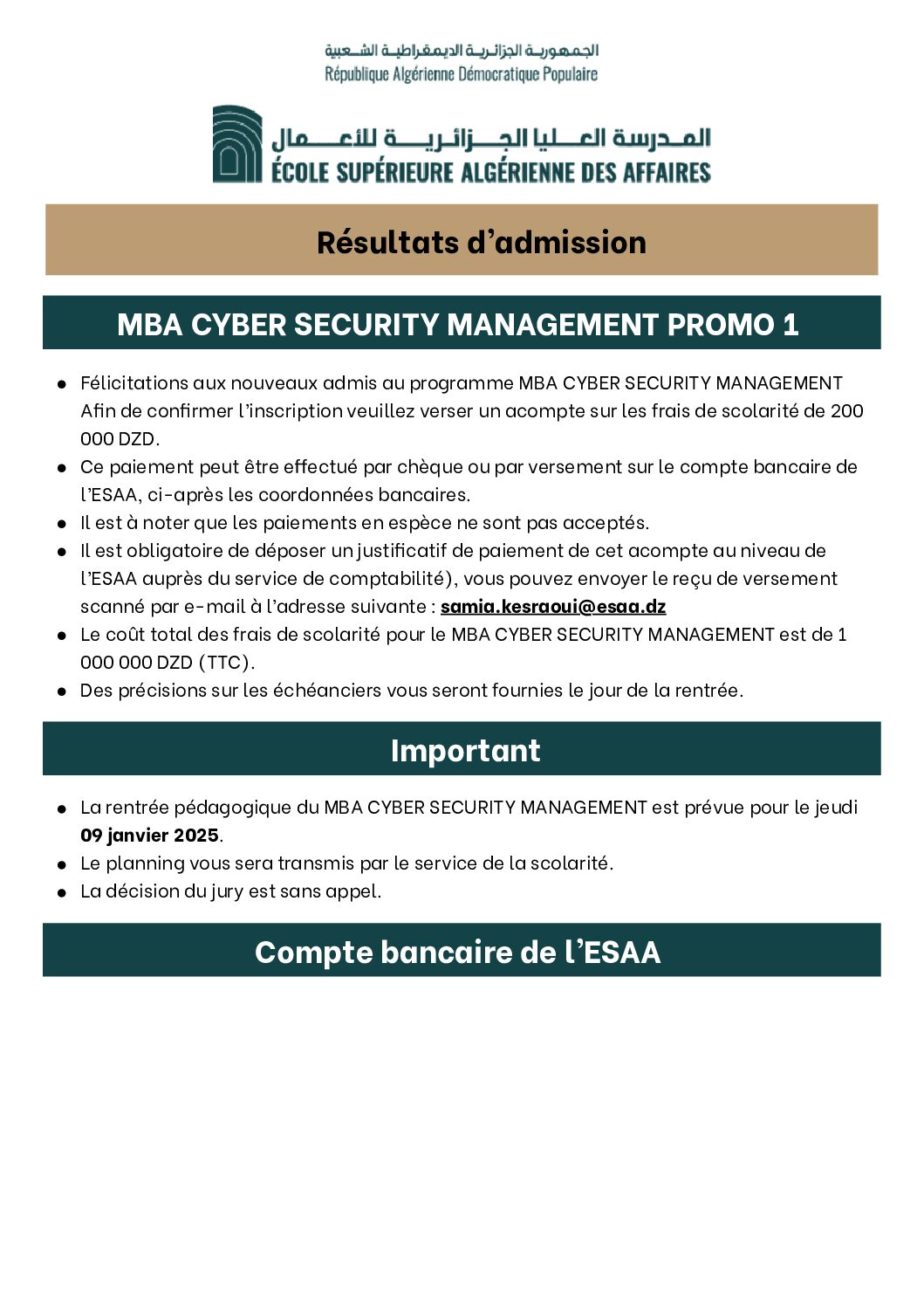 L’Ecole Supérieure Algérienne des Affaires (ESAA) est un établissement public d’enseignement supérieur, créée dans le cadre d’une coopération bilatérale, par le Décret Présidentiel n° 05-320 du 8 Chaâbane 1426 correspondant au 12 septembre 2005 portant ratification de l’accord relatif à la création de l’Ecole Supérieure Algérienne des Affaires, signé à Alger le 13 juillet 2004.